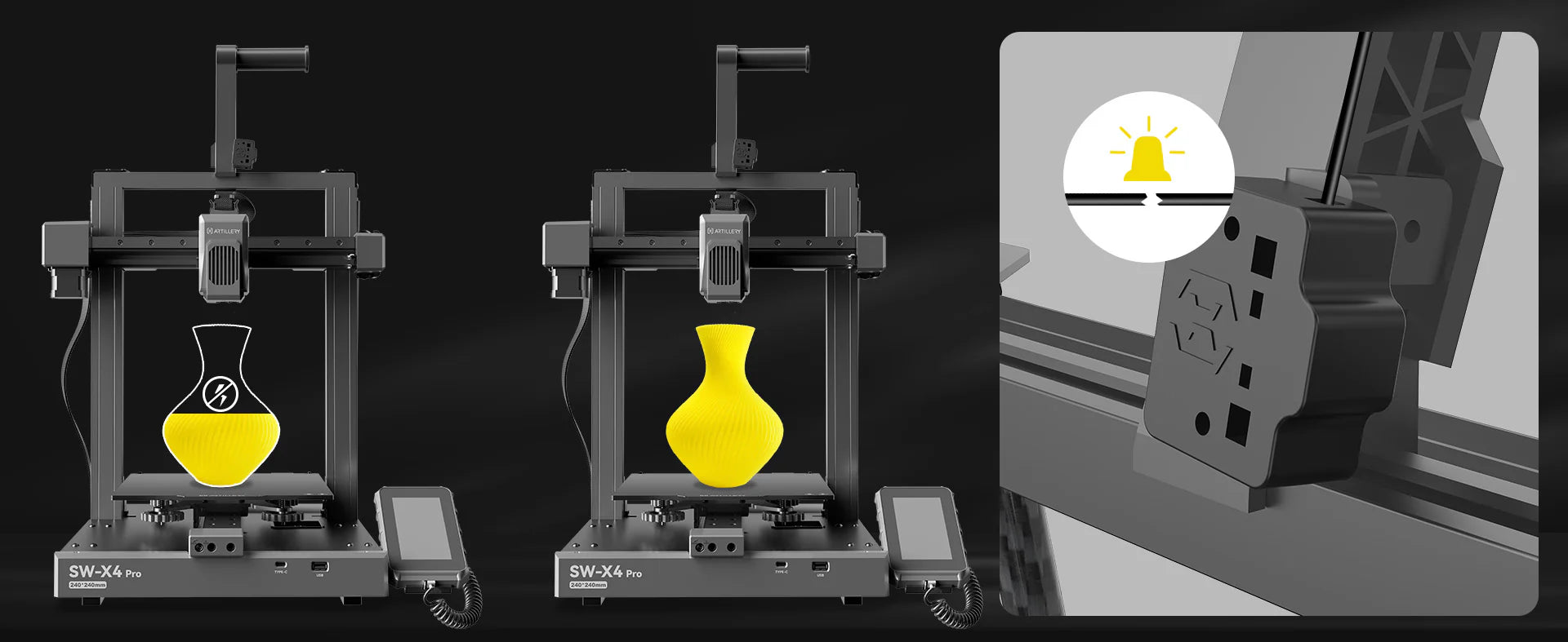 The resume printing function enables the Sidewinder X4 Pro to continue printing easily and perfectly after a power outage or pause printing.